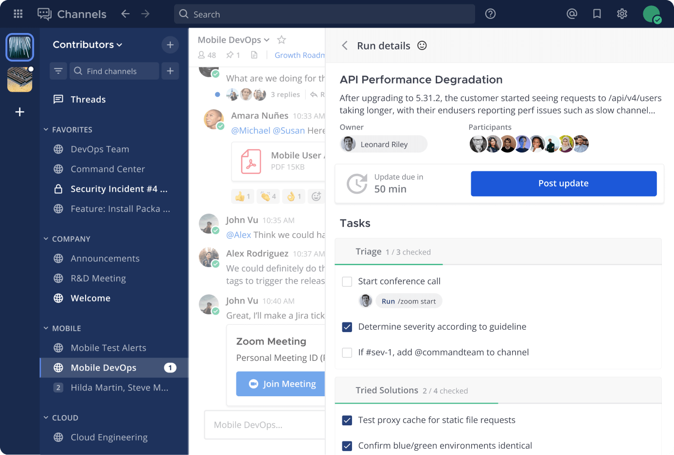 - Operational speed: Coordinate incidents, releases, and field ops faster with structured playbooks.