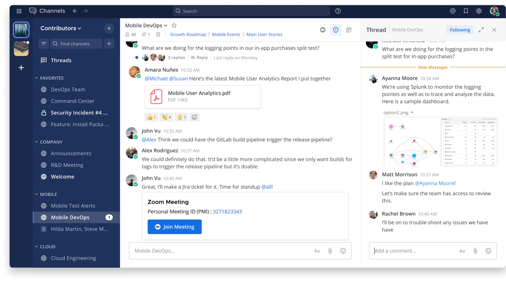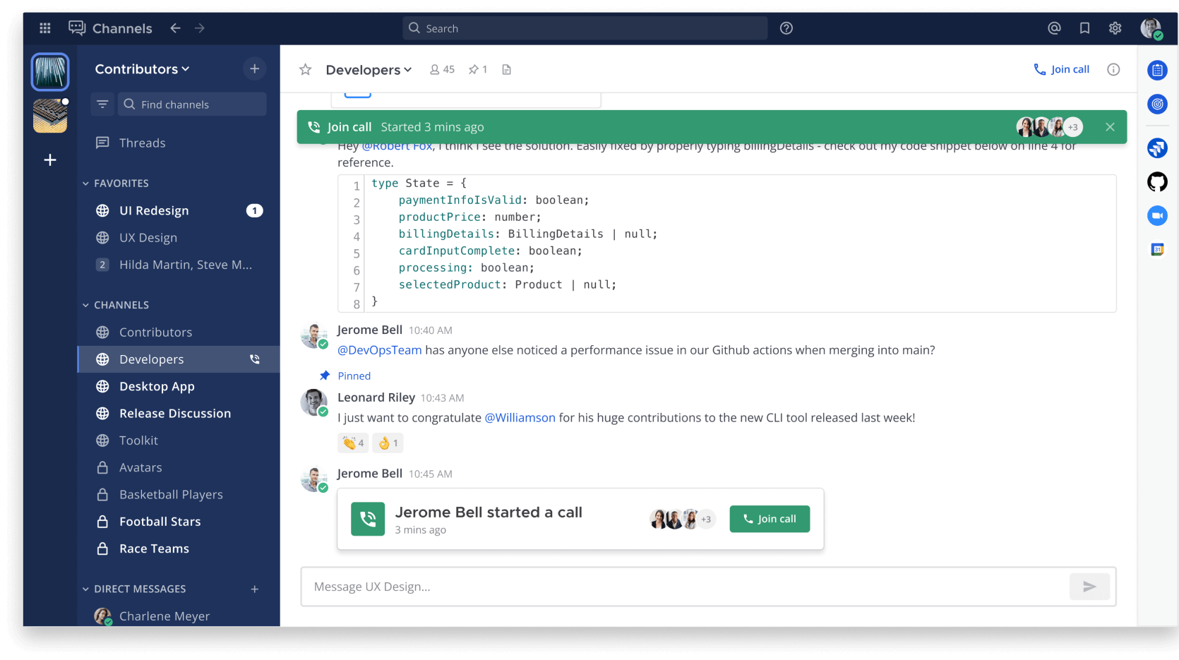 - Channels: Persistent, searchable conversations with messaging, calls, and screen share for operational teams.